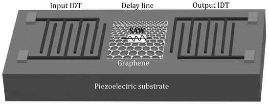 The surface acoustic wave (SAW) sensor is more common than the QCM sensor. Its working principle is based on the elastic loading effect. Figure 3 shows the schematic diagram of the SAW sensor, which has an input interdigitated transducer (IDT) and an output IDT built on both sides of a piezoelectric substrate []. The space between the input IDT and the output IDT is called the delay line. When an alternative voltage (AC) is applied to the input IDT, a surface acoustic wave (deformation of the surface of the piezoelectric substrate) is generated and propagates to the output IDT. Once the SAW reaches the electrodes of the output IDT, the deformation of the piezoelectric substrate is transformed into an electrical signal (voltage wave). The SAW travels much slower (speed of sound in the piezoelectric substrate) compared to an electromagnetic wave, resulting in an appreciable delay. If a coating is deposited in the space between the IDTs, the propagation of the surface acoustic wave is modified, which can be measured by a change in the delay time and/or the intensity of the output voltage. The adsorption of molecules on this coating (change of mass) will modify the propagation of the surface acoustic wave leading to a measurable change in the delay time or attenuation, which is exploited for manufacturing mass sensitive sensors. Interestingly, the electrical signal change is proportional to the gas concentration. With such a SAW sensor using a spin coated rGO layer, Tang et al. [] obtained a detection limit of 500 ppb for NH3 detection. This is attributed to the abundant oxygen-containing groups on the surface of rGO film, which strongly adsorb NH3 molecules and increase the film stiffness.