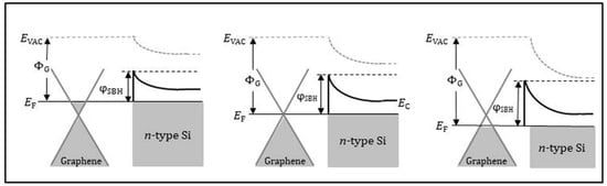 Schematic energy band diagram of the graphene/n-type Si interface for the pristine graphene state (middle), the graphene exposed to electron-donor gas (left) and the graphene exposed to electron-acceptor gas (right). EVAC, EC, ΦG, EF, and ψSBH indicate the vacuum energy, conduction band, graphene work function, Fermi level, and Schottky barrier height, respectively. Reproduced from (Hye-Young Kim, []), Copyright 2013, American Chemical Society.