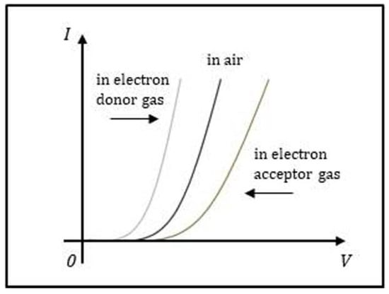 Schematic illustration of the I–V characteristics for a graphene/n-type Si Schottky diode sensor in air, exposed to electron-donor gas and electron-acceptor gas.