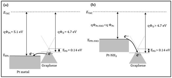 Energy band diagrams (a) for Pt and p-type graphene and (b) for Pt-NH3 phase and p-type graphene. EVAC, ΦPt, EFPt, ΦG, EFG, ΦPt-NH3 indicate the vacuum energy, Pt work function, Pt Fermi level, graphene work function, graphene Fermi level, and Pt-NH3 work function, respectively.