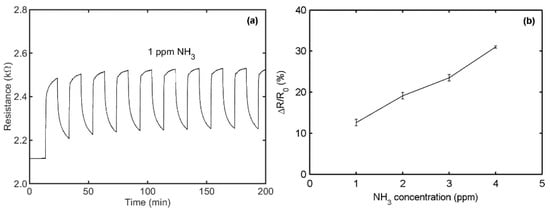 In Figure 11a, the resistance response of a typical PPy/rGO sensor for 1 ppm NH3 is presented at room temperature. A repeatable response of 12.6 ± 0.8% is obtained after 10 injections. Figure 11b gives the sensor responses to NH3 concentrations from 1 to 4 ppm, with a sensitivity of 6.1%/ppm. The key parameters of two sensors are added in Table 1 for easy comparison. Two sensors display specific sensing to NH3, high sensitivity, quick and reversible response, good stability, and immunity to humidity. These performances are associated with the synergistic effect of the ultrathin PPy layer and graphene.