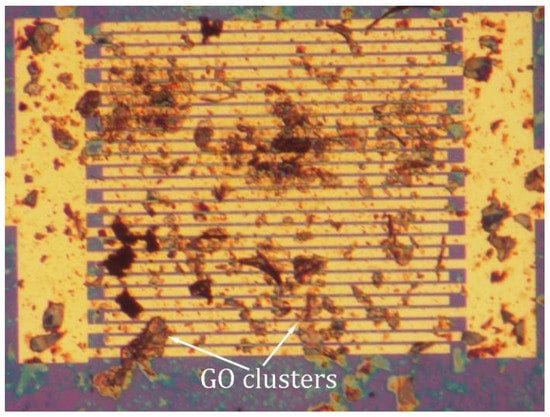 For large-scale production of low-cost graphene, one of the most popular approaches is the use of strong oxidizing agents to obtain GO and then convert GO to reduced graphene oxide (rGO) by thermal treatment or chemical reduction. In 1958, Hummers [] reported a method for the GO synthesis by using KMnO4 and NaNO3 in concentrated H2SO4. This method has broadly been used in gas-sensor fabrication because of its high efficiency. However, it still has a few drawbacks. For instance, the oxidation procedure releases toxic gasses and the control of the graphene oxide sheets is difficult. Recently, several modified methods were proposed in the literature to improve the control of the GO and rGO synthesis [,]. It is worth noting that the reduction in GO is not complete, and there are defects and OH groups in the final rGO [,].