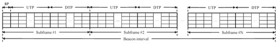 DG-LoRa uses a time-synchronized frame structure with a periodic beacon described in Figure 2. The first portion of the frame structure is the beacon period (BP). In the BP, the gateway sends a beacon at the beginning of the frame structure using SF allocated by the network server. The allocation enables multiple beacon transmissions by allowing each gateway to transmit beacons while using a different SF. After the beacon transmission, an end device establishes its frame structure by receiving the beacon from the gateway. The portion of the frame following the BP is called the uplink transmission period (UTP). In the UTP, the end device sends a message using pure ALOHA, which is a MAC protocol of LoRaWAN. If the uplink message is a confirmed type to be acknowledged by the gateway, the response message is sent in the downlink transmission period (DTP) following UTP. DG-LoRa allocates SF for GACK transmission under the premise that the server knows SF used for data transmission according to an SF allocation scheme for uplink transmission. In DTP, the server allocates resources to reply to the device with the same SF as the SF used for data frames that are sent from the device. Subsequently, multiple responses that can allocate the same SF are aggregated to send GACK. This strategy allows for the end device to receive GACKs without exchanging control messages with the server.