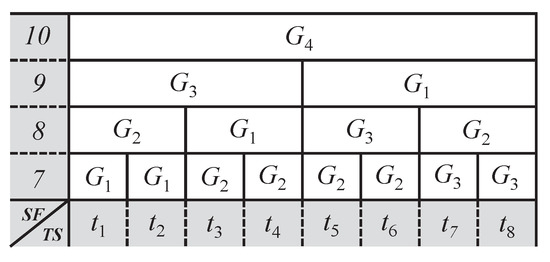 Figure 3 describes an example of timeslot allocation for GACK transmission in a network environment where SFs from SF7 to SF10 are available for communications between four gateways and end devices. We assume that is the GACK transmission from gateway j, being denoted by . First of all, each gateway transmits a GACK using different SFs at the beginning of the DTP. Among all gateways sending GACKs in the first timeslot, ends GACK transmission at the earliest time using the lowest SF for the transmission. After completes the GACK transmission in the first timeslot, it sends a newly generated GACK using SF7, which is not used to transmit the GACKs from other gateways in the second timeslot. In the third timeslot, and send other GACKs using the remaining SFs, except for the SFs that were used by GACK transmissions from and . These procedures may acknowledge receipt of a large number of uplink transmissions by simultaneously transmitting multiple GACKs using different SFs. If some data frames transmitted from end devices are not acknowledged due to the limited number of GACK transmissions in the current subframe, a GACK for the end devices generates in the next subframe.