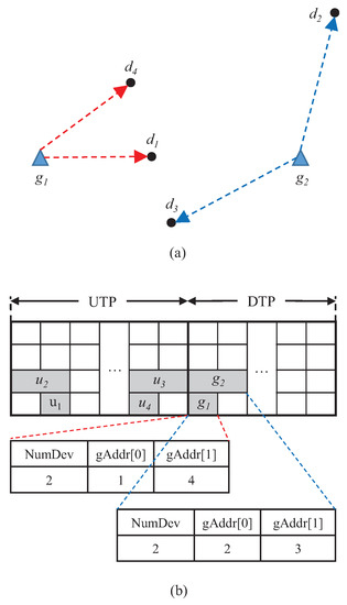 Figure 4 describes the procedure for exchanging GACK to acknowledge data frames that are transmitted from four end devices. In this figure, the end device with the address i is denoted by , and the uplink transmission from is represented by . We assume that SF7 is used for transmitting GACKs to be delivered to and , while SF8 is considered for communications between gateways and both and end devices. In this case, multiple GACKs can be simultaneously transmitted via two gateways using different SFs. The destination devices of GACKs that are transmitted from are and , and sends the GACK by using SF7 in the first timeslot of DTP. While another gateway sends GACK to and end devices by allocating the first and second timeslots.