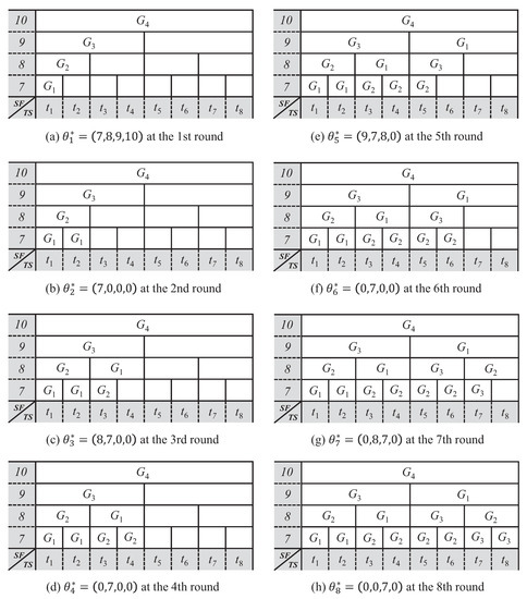 Figure 5 describes the resource allocation procedure for GACK transmission in the network environment introduced to explain Figure 3. Because all gateways are idle gateways in the first timeslot of DTP, resources are allocated, so that multiple GACKs from all gateways are simultaneously transmitted using different SFs (e.g., ). The in which GACK transmission allocated in the first round is completed first becomes an idle gateway in the second timeslot, and resources are allocated in the second round, so that the can start GACK transmission in the second timeslot. In the second timeslot, all of the SFs, except SF7, are already occupied by other GACK transmissions, thus resources are allocated in the second round, so that the gateway sends GACK using SF7. In the third round, resources are allocated, so that gateways and , which have completed GACK transmission allocated in the previous two rounds, can start GACK transmission in the third timeslot. Assume that the number of end devices receiving GACK is maximized when using SF8 and SF7 for GACKs that are sent by and gateways (i.e., ). Through resource allocation according to this round repetition, SF and timeslots are allocated, so that idle gateways of each round can transmit GACK until the end of the DTP section.