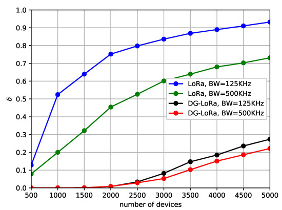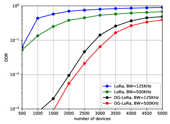 Figure 7 illustrates the DDR of both LoRaWAN and DG-LoRa as the number of end devices increases. In the figure, we represent the performance behavior against different channel bandwidth of 125 KHz and 500 KHz. In this scenario, two gateways are connected to the LoRa network, and the coding rate sets to one. It is observed that the DDR of LoRaWAN and DG-LoRa increases as the number of end devices that are deployed in the network increases. The degradation of performance due to the increase in the number of collisions of transmitting messages as the number of end devices increases. However, the performance of DG-LoRa is higher than that of LoRaWAN, regardless of the number of end devices that are connected to the LoRa network. The simulation results show that DG-LoRa connects approximately five times more end devices to the network than legacy LoRaWAN, while satisfying 5% DDR. DG-LoRa supports over 2500 end devices to be connected to the LoRa network with 125 KHz channel bandwidth if the target DDR is 5%, while LoRaWAN is difficult to connect even 500 end devices to meet the target performance. This is because DG-LoRa improves network scalability by supporting GACK transmission in a frame structure that separates the uplink and downlink periods. Meanwhile, the performance with 500 KHz channel bandwidth slightly increases compared to that of 125 KHz channel bandwidth. This implies that a higher data rate in 500 KHz channel bandwidth is the dominant factor in performance improvements.