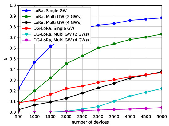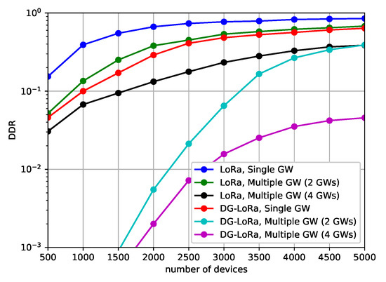 Figure 8 shows the performance behavior of the DDR according to the number of gateways to investigate how many gateways are required to connect end devices that are deployed in the geographical area. We consider both single gateway and multi-gateway environments in this scenario. In single gateway environments, one gateway that is located in the center of the area is connected to the network, while several gateways are located on the fixed position in the multi-gateway environment, as shown in Figure 6. The simulation results show that DG-LoRa and LoRaWAN are difficult to achieve less than 5% DDR when more than 1000 end devices are deployed with a single gateway environment. This means that the single gateway makes it difficult to communicate over wireless links with thousands of end devices due to its half-duplex RF transceivers. Meanwhile, increasing the number of gateways improves the network performance. DG-LoRa supports over 5000 connections while satisfying a 5% DDR in the LoRa network with four gateways, and LoRaWAN can connect 1000 end devices to the network. This is because the number of GACKs transmitted by gateways in the DTP section increases, thus more devices can receive responses to data transmissions.