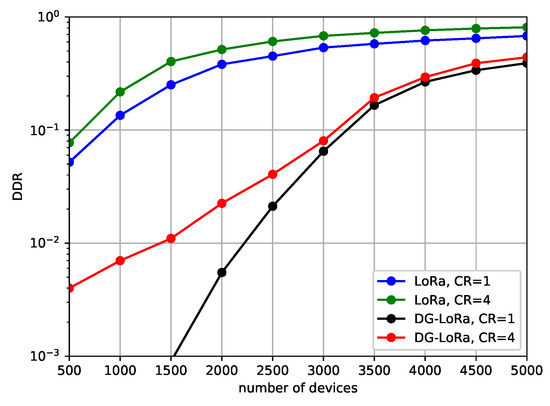 We evaluate the DDR against the number of end devices to investigate how many end devices can be connected to the network. The DDR represents the ratio of the number of dropped data frames to the total number of arrival data frames. The dropped data frame indicates that the frame cannot be successfully delivered after transmission attempts, where is the maximum allowable number of retransmissions. The MAC protocols DG-LoRa and LoRaWAN that are to be evaluated the performance are inherently subject to transmission failure, due to ALOHA-based random access for data transmission. However, there are differences between the two protocols in the process of responding to data transmissions. In LoRaWAN, other transmissions may interfere with an ACK transmission, while DG-LoRa supporting deterministic GACK transmission does not cause transmission failure by colliding with other transmissions in the network. However, GACK transmission failure may occur due to the limitation of the number of GACKs that can be transmitted in DTP. If the transmission failure occurs, even after transmission attempts due to such transmission failure factors, the data frame is dropped. In this section, we evaluate DDR performance and discuss the results that are based on the difference in the process of responding to data transmissions between legacy LoRaWAN and DG-LoRa.