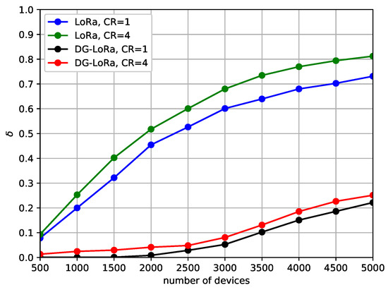 Figure 9 describes the DDR against different coding rates. As expressed in Equations (4) and (5), the coding rate directly affects the duration of message transmission, thus the performance behavior due to the variation of frame length can be observed in this scenario. We consider two gateways in the LoRa network with a channel bandwidth of 500 KHz. Simulation results show that network performance improves as the coding rate decreases, but the performance difference is not noticeable as compared to the gap of performance according to the number of gateways and channel bandwidth. However, it is observed that the difference in performance of LoRaWAN is slightly larger than that of DG-LoRa. In a network environment where 5000 devices are deployed, the performance gap between different coding rates is approximately 20%, which is higher than the performance difference in DG-LoRa. This is mainly because the number of other transmissions interrupted by the long duration of transmission in LoRaWAN is larger than that of DG-LoRa. In LoRaWAN, the transmission interferes with other transmissions while using the same frequency channel and SF regardless of the direction of link transmissions. On the other hand, DG-LoRa supports a frame structure in which uplink and downlink transmissions are separated to avoid interference between uplink and downlink transmissions, thus the performance degradation is not noticeable by increasing coding rates.