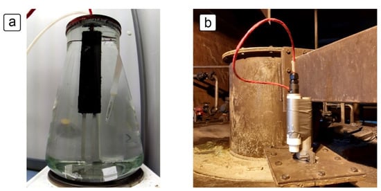 Exposure to industrial conditions was performed in a solution with varying concentrations of sulfuric acid, chloride ions, fluoride ions, ferric ions and arsenic ions. An example of the exposure arrangement is shown in Figure 3b, where a datalogger was strapped to a metal tube with the sensor inside. The cable and tube were long enough to reach the solution inside the tank, such that the sensor was fully immersed in the process solution.