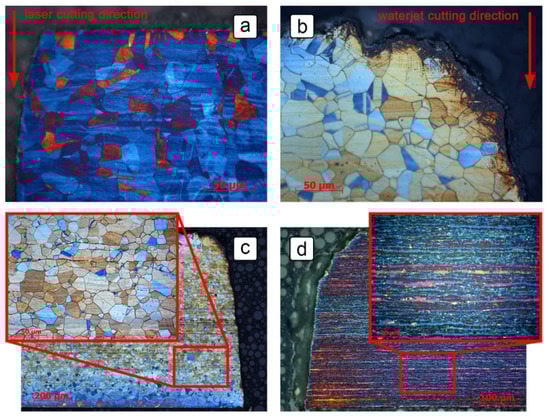 Metallographic images of: (a) the angular shape of the laser cut edge in the grade 316L steel sheet; (b) strain-induced deformation martensite formed on the edges of the steel sheet cut by abrasive waterjet technique; (c) the austenitic microstructure of steel grade 316L with longitudinally oriented inclusions and phases; (d) the microstructure of steel grade 2507 with elongated crystal grains in the rolling direction of the steel.