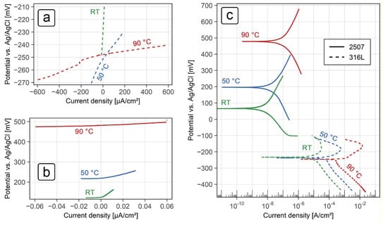 (a) Linear polarization curves for the grade 2507 stainless steel in a 10% H2SO4 solution with 5000 mg/L NaCl at various temperatures; (b) linear polarization curves for the grade 316L stainless steel in a 10% H2SO4 solution with 5000 mg/L NaCl at various temperatures; (c) potentiodynamic polarization curves for both grades of stainless steel in a 10% H2SO4 solution with 5000 mg/L NaCl at various temperatures.