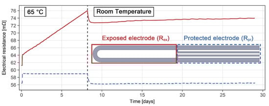 In order to test the validity and accuracy of the ER sensor measurements, and the durability of the various sensor components, an ER sensor made of grade 316L steel was exposed to the 10% H2SO4 solution with 5000 mg/L NaCl for 28 days, at 65 °C and at room temperature. Results showing the electrical resistance of the exposed working electrode (Rex) and the protected electrode (Rpr) are shown in Figure 7. The initial electrical resistances of the exposed and protected part of the 316L probe at room temperature were measured as 61.23 mΩ and 56.74 mΩ, respectively. During the first 8 days of exposure, the temperature was maintained at 65 °C. The electrical resistance of the protected electrode was very stable during this period, maintaining a value of 59.0 mΩ. The electrical resistance of the working electrode, on the other hand, changed significantly, increasing from 64.1 mΩ to 76.0 mΩ during the same period. The necessity for temperature compensation was clearly shown in the second part of the exposure period, when the sensor was exposed to changes in room temperature. Immediately following the end of the 65 °C exposure period (indicated by the dashed vertical line in Figure 7), a drop in the electrical resistance of several mΩ could be observed in both the exposed and the protected electrodes. Additionally, as the exposure continued, daily variations and a slow general increase in electrical resistance were detected in both the exposed and protected electrodes. Both such effects were compensated for when analyzing the results.