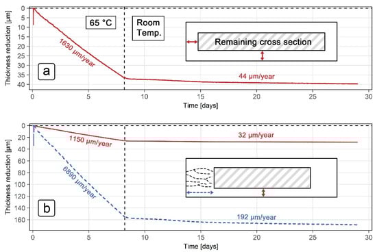 The second model, shown in Figure 8b, corrects this disparity by separating the reduction in thickness into normal and transverse directions. According to the improved interpretation of the ER results, the reduction in thickness at the end of the exposure was 27 µm in the normal direction and 165 µm in the transverse direction. The corrosion rates in the second model (Figure 8b) were also modified accordingly in both directions. In the normal direction, the values for the corrosion rate decreased slightly compared to the first model, specifically 1150 µm/year at 65 °C and 32 µm/year at room temperature (solid line, Figure 8b), whereas the corrosion rates in the transverse direction increased significantly (dashed line, Figure 8b), with new values of 6890 µm/year and 192 µm/year at 65 °C and room temperature, respectively. Although the corrosion rates in the normal direction remained comparable to corrosion rates obtained using the electrochemical techniques (Table 4), corrosion rates in the transverse direction increased by a factor of 6, showing the importance of taking into account the microstructure when evaluating corrosion rates from ER measurements.