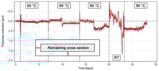 In addition to exposure of the grade-316L sensor, the ER sensor made of grade 2507 steel was similarly exposed to the 10% H2SO4 solution with 5000 mg/L NaCl for 28 days. Since the postexposure examination did not show any notable damage to the grade 2507, the k value in Equation (4) was assumed to be 1. The initial electrical resistances of the exposed and protected part of the 2507 probe at room temperature prior to the exposure were measured as 68.36 mΩ and 63.00 mΩ, respectively. The thickness reduction results for the steel grade 2507 are presented in Figure 9. The results were consistent both with observations of corrosion behavior and the electrochemical measurements. Minimal corrosion was recorded at all temperatures (Table 3 and Table 4), which also suggests corrosion would not impact the service life of equipment made from such steel. Only some discrete jumps, up to 0.5 µm around the baseline, were detected at 10, 14, 17, 20 and 24 days of exposure (Figure 9). These perturbations were present due to external experimental factors, such as physically moving the sensor or the measuring device, changing the temperature around either the sensor or the measuring device, turning the heating system on and off, and refilling the solution due to evaporation. Once enough corrosion occurs (equating to a reduction in thickness of at least 2–3 µm), the impact of these external factors on determining accurate corrosion rates significantly reduces.