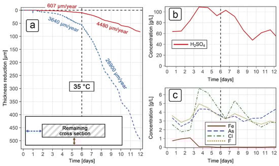 The results for the grade 316L sensor (Figure 10a) show two distinct regimes with relatively stable corrosion rates, which occurred during the first and last 6 days of exposure. In the first 6 days of exposure, the corrosion rates were measured to be around 600 µm/year in the normal direction, and around 3640 µm/year in the transverse direction. Both corrosion rates increased significantly after day 6, with average values of 4480 µm/year in the normal and 26,900 µm/year in the transverse direction. Such high corrosion rates indicated that, even in the relatively short 6-day exposure, severe corrosion damage was expected. The expected lifetime of a grade 316L ER probe in such conditions would be 1 month at most, provided no mechanical damage or localized corrosion occurs. Additionally, a 5 mm thick acid tank made from this steel grade would keep its integrity for less than 1 year. Throughout the exposure, the temperature remained relatively stable at 35 °C, while the concentrations of both sulfuric acid (Figure 10b) and the various ions (Figure 10c) changed over time. The results show that, in the second half of the exposure, the concentrations of sulfuric acid, chloride ions and fluoride ions decreased compared to the first 6 days of the exposure, indicating that such conditions were beneficial for corrosion in the grade 316L steel. The sulfuric acid and the chloride ion concentrations dropped by approximately 50% (from 110 to 60 g/L, and from 6 to 3 g/L, respectively), while the fluoride ion concentration lowered from 5 to 3 g/L. The concentration of arsenic ions remained relatively stable, hovering between 3 and 4 g/L, while the iron concentration was only significant during the first 3 days of exposure (1 g/L). The presence of fluoride and arsenic ions was likely the reason for the significantly higher corrosion rate of the material under industrial conditions compared to the laboratory tests.