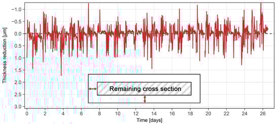 In order to test the behavior of the ER sensor in real, uncontrolled conditions, both steel grades were exposed to solution under industrial conditions (Figure 1a and Figure 3b). The reduction in thickness for the grades 316L and 2507 is shown in Figure 10a and Figure 11, respectively. When interpreting the thickness reduction from the resistance measurements, the same k values were taken as for the laboratory exposure for both grades of steel (k = 6 for grade 316L and k = 1 for grade 2507). The varying composition of the solution to which the grade 316L sensor was exposed is also shown in Figure 10b (H2SO4 concentration) and Figure 10c (various ion concentrations). The grade 2507 was exposed to similar conditions at a later time.