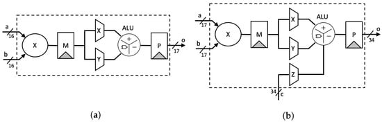 Figure 2. Digital signal processor (DSP) utilization setup: (a) 16-bit multiplier; (b) 17-bit multiply-accumulate. - Stage-2: We again utilize the DSP cores as a 17-bit Multiply-Accumulate (MAC) function to compute the Karatsuba–Ofman multiplication, . and are obtained from the output of RCAs at the first stage, as shown in Figure 2b.