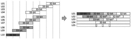 Figure 3. Example of alignment for intermediate values in a 64-bit multiplier.All aligned intermediate values, including the input , are assembled by CSAT where the compressor components in the CSA use LUT6_2, a similar 3:2 compressor circuit proposed by []. However, while they use multiple compressor circuits (e.g., a 4:2 compressor in []) to construct the multiplier, we employ the homogeneous 3:2 compressor to achieve a balanced performance, as illustrated on Figure 4.