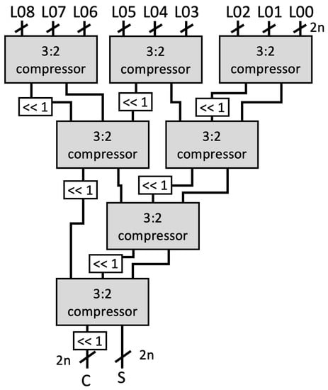 Figure 4. Example of Carry Save Adder Tree (CSAT) for nine inputs. - Stage-6 and 7: The and as the outputs of CSAT are then fed to the carry-select adder to obtain the final product. Note that we use the carry-select adder proposed by Nguyen et al. [] due to its relatively short delay propagation. In the carry-select adder by [], both options for the carry are computed. Subsequently, the carry is solved similarly to that of the carry-lookahead adder (CLA). Lastly, the sum output is then generated with the final carry for each bit [].