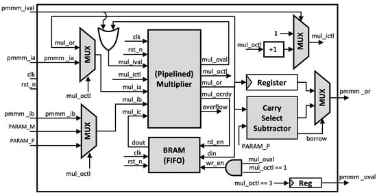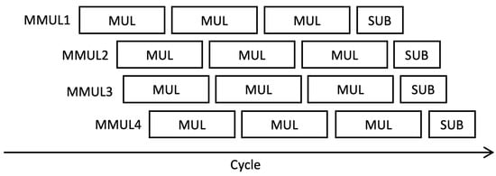 In our pMMM architecture as shown in Figure 5, a single execution of Montgomery modular multiplier consists of three steps of multiplications and one step of subtraction, divided into four steps as follows: