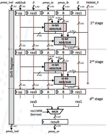 Modular addition and subtraction operations also play a significant role in an ECC architecture, which also affect the processor’s performance. The authors of [] propose a unified 64-bit modular adder/subtractor that is designed to work with redundant numbers. However, their design can not be pipelined and uses a shift register to compute modular adder for higher bit length. In this paper, in order to match the speed of our multiplier, we introduce the pipelined version of the modular adder/subtractor in [], which is also able to operate as a modular adder or subtractor by specifying the input . Furthermore, instead of fixing the radix to a 64-bit operand, the radix in our design can be adjusted by specifying the number of stage d. Thus, the performance of our modular adder/subtractor can be adjusted depending on the requirement and available hardware resources. We refer to our architecture as the pipelined modular adder/subtractor (pMAS).