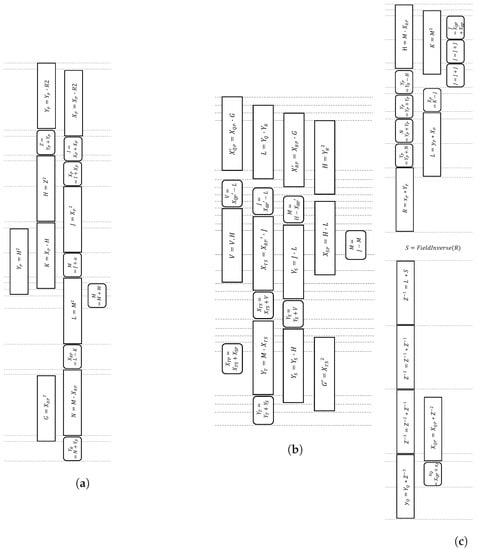 Proposed scheduling for Montgomery (a) ladder setup; (b) ladder update; and (c) ladder final.