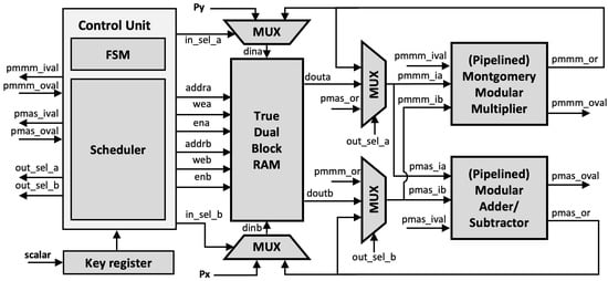 The proposed generic ECC architecture is shown in Figure 9. In addition to the pMMM and pMAS module, True Dual Port (TDP) RAM is implemented using BRAMs, which reduces the slice overhead. All operands and constants are stored in the TDP RAM.