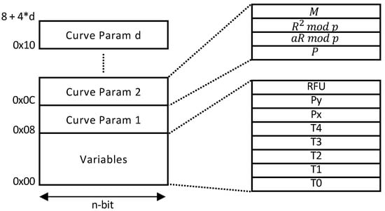 Our architecture also supports multi-curve parameters in a single ECC processor. The architecture in Figure 9 can be transformed into a unified architecture since pMMM and pMAS do not restrict to any modulus value or form. However, a few modifications are required in the pMMM modules. In particular, the input and output of the third multiplication in Algorithm 3 require to be sliced, depending on the modulus size. This can be done by implementing a multiplexer to both input and output of pMMM at Step 3. Nevertheless, other components in the architecture remain the same. Additionally, since the curve domain parameters are stored in the BRAM, extending the support to different curve parameters will only increase the BRAM depth without affecting other modules (e.g., pMMMs, pMASs). The address map is shown in Figure 10.