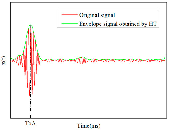 Hilbert transform (HT) is a linear time-invariant filter used in signal processing [38]. HT is used to calculate the envelope signal of the collected strain responses. The abscissa corresponding to the maximum value of the envelope signal is usually used to calculate the ToA, and it can effectively distinguish the sequence of the ToA of each sensor. A schematic diagram of the envelope signal obtained by the HT is shown in Figure 2. The signal after the HT can be obtained by Equation (5).