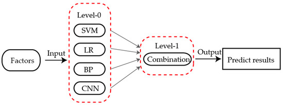 The stacking-based ensemble method was first proposed by Wolpert [41]. Unlike most existing ensemble learning methods, stacking uses meta-learner techniques to combine different types of algorithms. The structure of stacking consists of two levels, namely level-0 and level-1. The outputs of multiple base learners (level-0) are combined by the meta-learner (level-1), as shown in Figure 3 [42]. These machine learning methods from level-0 are commonly used for basic predictors, and the other methods from level-1 are usually for the combination of those base learners.