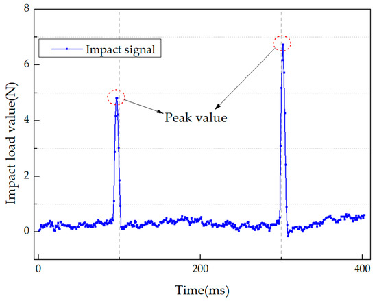 The whole experimental operation can be referred to in Figure 5. In the impact monitoring experiment, the specimen was firstly divided into 40 mm × 40 mm grids. Then, the hammer was used to create impact in each grid. The location of the impact was recorded manually, and the signal generated by the impact was transmitted through the pressure sensor on the hammer and recorded using National Instrument. As shown in Figure 10, the maximum value of the impact signal in this figure was defined as the peak value. At the same time, the strain responses caused by the impact were received by the FBG sensors embedded in the specimen and recorded by the fiber demodulator. The sampling frequency is 19 khz. After that, all the strain responses were processed by the HT. The envelope signals obtained by the HT were set as the input of the base learners. Meanwhile, the impact peak values and locations were set as the output of the base learners for training and testing. Finally, the preliminary identification results obtained by the base learners were set as the input of the meta-learner to predict the final results. A total of 295 groups of signals were collected on the specimen.
