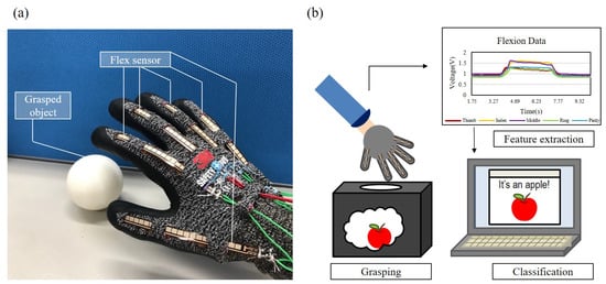 An overview of the proposed flexion glove. (a) A photo of the flexion glove. (b) The proposed method can classify a target object by a single grasp with the flexion glove.