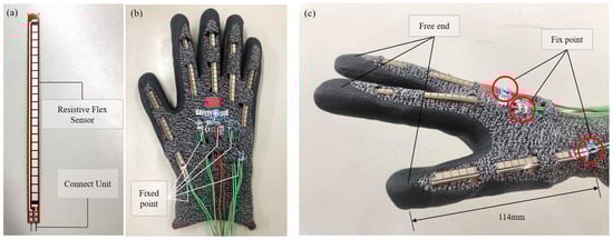 The design of the glove. (a) A photo of the flex sensor. (b) The arrangement of the sensors on the glove. (c) The installment of the sensors.