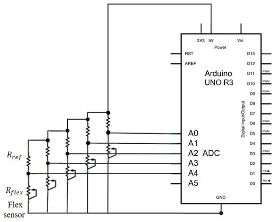Figure 3 shows the circuit connecting the five flex sensors to a microcontroller (UNO rev3, Arduino Co., Ivrea, Italy). Each flex sensor is represented by an adjustable resistor as shown in the voltage dividers in Figure 3. The signals of bending are acquired from the analog-to-digital converter on the controller. For example, when the bending of the flex sensor results in a resistance value of l = 47 kΩ, the input voltage, 5 V, is divided into half as 2.5 V for the microcontroller. The analog signal will be resolved in 10-bit resolution, that is, 0–5 Volt is divided into 1024 discrete levels. When the resistance goes up as the sensor being bent more, the output voltage would increase accordingly. The resistance of the flex sensor can be calculated from the acquired voltage signal with the following equation
