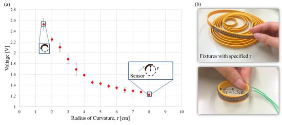 Figure 4 shows the repeatability test of the flex sensors. Figure 4a,b show the test results and photos, respectively. Ring-shape fixtures with 14 different radii, r, are printed using a 3D printer. The bending voltage of the flex sensor are measured when the sensor is bent along the fixture surface. The test is repeated 5 times for each fixture. The average values and the standard deviations are plotted, where the ratio between the standard deviation and the voltage signal is 3% in average. The results show that the response of the sensor is fairly stable, particularly for the radii greater than 4 cm.