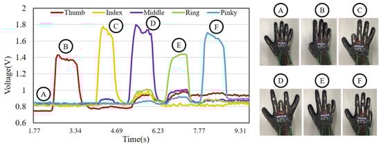 Figure 5 shows the raw data collected from the sensor glove during a functional test. The subject who performed the test is asked to fully curled her fingers one by one and the flexion reflects the change in the voltage signal. Different colors are used to represent the signals of the five fingers in Figure 5. The results show that the bending of each finger can be independently detected.