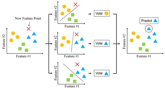 Figure 6 shows an example of the voting algorithm for the classification among three classes. The three classes are plotted as the circle, square and triangle on a feature plane of feature #1 and #2 in Figure 6. A new data point is plotted as the red-crossed mark in Figure 6. The new data set is classified between any two of three classes, as illustrated in the second row in Figure 6. and the determined class gets one vote. Because the class of triangle collects the highest votes among the three classes, the final classification of the new data set will be the triangle class.