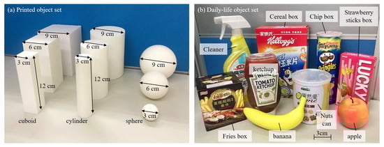 Two sets of objects are tested in the experiments. (a) The set of printed objects. (b) The set of daily-life objects.