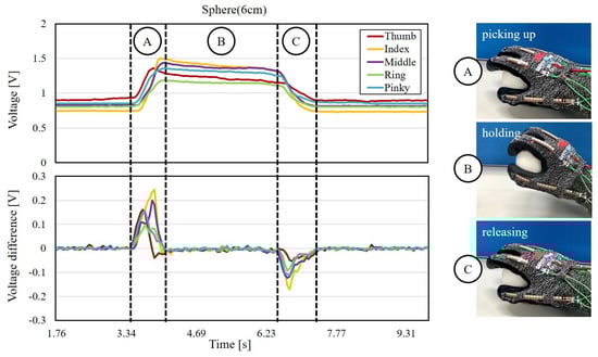 The signals of grasping are separated into three phases, which are picking up, holding and releasing, based on the state of grasping using the differentiated voltage values. The first phase is named the phase of picking up, and is started from the moment when a sudden change of signals is detected from the straightened fingers. This phase is where the subject’s hand is picking up an object, and the fingers are curling up to adapt the exterior of the object in this phase, as shown in Figure 8. The second phase is named as the phase of holding, and is started when the signals are stabilized, meaning the five fingers are maintained in the same posture for holding the object. The phase of holding ends when the signals of sudden declination are detected. The third phase is named the phase of releasing, and is where the five sensors readouts return to the initial states. In this work, all the features are extracted from the phase of holding, where the flexion contains the information of shape and size of the object.