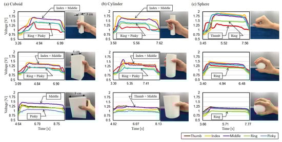 Figure 9 shows nine examples of flexion data from grasping each of nine different printed objects, along with grasping photos. For a better visualization of the grasping gestures, the photos in Figure 9 were taken with the same subject performing the grasping without wearing the glove. Figure 9a–c are the flexion results obtained from grasping the objects with the shapes of cuboid, cylinder and sphere, respectively. Each shape has three different sizes as specified in Section 3.1. The grasping of the objects from the smallest to the largest are shown from the top row to the bottom row in Figure 9. Five different colors of curves in each result indicate the flexion of five fingers, where red, yellow, purple, green and blue represent the thumb, index, middle, ring and pinky fingers, respectively.