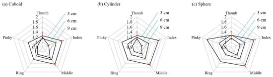 Figure 10 shows the extracted features from grasping the printed objects. The features are the stable flexion signals during the holding phase. The values are obtained with the criterion in Equation (4) from the signals shown in Figure 9. The averages and standard deviations of the features of all the 180 tests, from 20 repetitions of the same test, are plotted with data points and error bars in the radar plot in Figure 10. A clear tendency can be immediately observed from the three charts in Figure 10 that the flexion signals decrease when the size of the object is increased. It is because when the size of an object increases, the fingers would bend less to fit the exterior of the object. Another observation is that the flexion signal of the thumb usually does not change as much as other fingers while the standard deviations of the thumb are greater than the other four fingers. It can be interpreted as that the subject tends to curl her other four fingers to hold the object, and the role of thumb is dispensable.