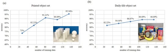 The relation between the number of training data and the accuracy of object classification. (a) The results of the set of printed objects. (b) The results of the set of dialy-life objects.