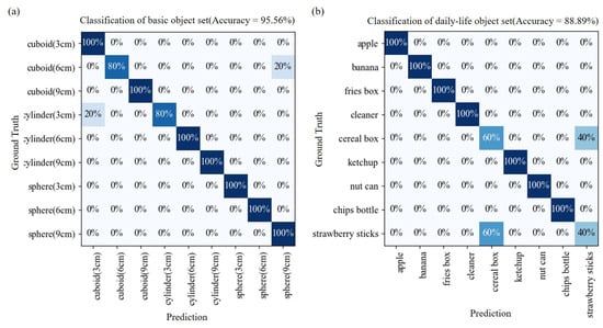 A confusion matrix is a common presentation method which is usually used to display the performance of a classification. Figure 12a,b are the confusion matrices for the classification with the set of printed objects and daily-life objects, respectively. Each of the confusion matrix include 45 prediction results. The vertical and horizontal axes of the confusion matrices are the ground truth and the prediction of the SVM classifier. That means, the prediction is more accurate if more data falls in the diagonal, from upper-left to lower-right, of the matrix. The values on the matrix table are the percentages of test data falling in a class. For example, the value of 20% located at the ground truth of “cylinder (3 cm)” and the prediction of “cuboid (3 cm)" in Figure 12a indicates that there is 1 count out of 5 cylinder with the width of 3 cm being misclassified to the category of the 3 cm cuboid. The ideal case for a classification would result in concentrated values along the diagonal of the matrix, which indicate the prediction well match the ground truth.