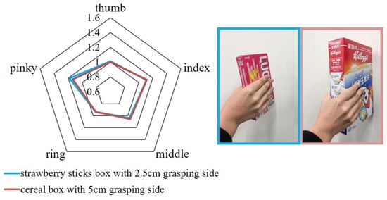 From the confusion matrix shown in Figure 12b we find that the cereal box and strawberry sticks box are the most frequently misclassified cases among all 9 classes. 40% of cereal box, 2 out of 5, been misclassified as strawberry box and 60% of strawberry box, 3 out of 5, been misclassified as cereal box in the 45 times of test. Figure 13 shows the comparison of the two misclassified cases. It is observed that they all share some extent of similarity in grasping posture regardless of the object shape. For example, in Figure 13 the radar chart is form by the features of holding two misclassified objects, and highly overlapped data are shown. The misclassification is believed due to the reason that the two objects have the similar shape. The size of the sides that were being held were 2.5 cm and 5 cm for strawberry box and cereal box, respectively. The main difference between the posture of holding two objects is the angle between the thumb and index finger while the flexion from the fingers did not change very much. It shows that the glove may not be very sensitive when it comes to the shape of cuboid with different thickness on one side. The success of the classification may be sifnificantly improved with installation of an additional sensor between thumb and index finger.
