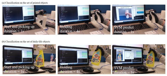 The glove is able to perform object classification in real-time with pre-trained classifiers. Photos of the real-time tests, which is also known as grasp-to-see application in this paper, are shown in Figure 14, where Figure 14a,b are the step-by-step photos for the classifications on the set of printed objects and the daily-life objects, respectively. In the grasp-to-see application, the user is first asked to sit in front of the computer and to follow the instruction on the screen. Once the test starts, the user is instructed to pick up the object on the desk within 1 s while at the same time, the flexion signals are started being collected through the serial ports on an Arduino board to the SVM program on the computer. After picking up the object, the user is instructed to hold the object for 4 s for the program to extract features from the flexion of his/her five fingers. The extracted features are plugged into the SVM classifier and it takes around 1 to 1.5 s for classifying the object. The whole process takes about 6 s to identify a given objects in the pre-trained classes. It only requires one single grasp for the object classification.