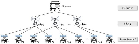 Instead of FL computation, which is for conducting ML/DL learning via distributed computing platforms and then aggregating the results in a centralized platform to build a global model, centralized learning is optimal in terms of learning accuracy [,]. However, having all data in a centralized platform is not easy. Especially with this water quality monitoring problem, it is not realistic to assume that all sensing data can be gathered in a centralized platform simultaneously, due to geologically physical distances. This issue can be solved by utilizing a number of edge servers (i.e., local distributed computing platforms in FL) that are distributed in a slightly closer position to the sensors []. In addition, a global model which aggregates several model parameters from multiple distributed edge servers can be efficiently and effectively built via FL without sharing all sensor data with the central server. In fact, FL computation allows for the global model to derive performance close to central computing while reducing the communication cost of the entire networking systems [,,]. For this reason, we design a network system which consists of multiple edges, distributed smart sensors, and a central server. Therefore, our network architecture can be illustrated as shown in Figure 1.