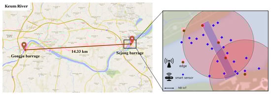 Overall network architecture: This shows Gongju barrage and Sejong barrage in the Keum River, where the actual green tide is found in Korea are considered in this paper. Several edges and smart sensors are distributed around one barrage and are designed to communicate through NB-IoT. The red dot shown in the figure is edge located on the barrage and the blue diamond is smart sensor that measures water quality in the river.