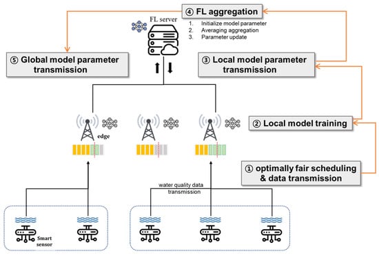Remarkable research results for water quality management and monitoring have been proposed, especially for green tide phenomenon [,,,,,,]. The precise and accurate case study results for various sensor network and vehicular network situations are presented in [,,,]. The smart sensor design for water quality monitoring is precisely discussed in [,], In [], a drinking-water quality model is proposed to predict water quality using big data with DL methodologies by utilizing long short-term memory (LSTM) for time-series prediction. The drinking-water quality data measured by the automatic water quality monitoring stations of Guazhou Water Source of the Yangtze River in Yangzhou are used to analyze the water quality parameters in detail, and finally, the prediction model is trained and tested with monitored real-world data from January 2016 to June 2018. The results of the study present that the prediction values of several water quality indicators and the actual values are almost equivalent. The proposed algorithm in [] predicts the trends of measurement variations in several water quality indicators. The drinking-water is managed by comparing the prediction values and reference values of each component determined by the water quality. However, this model is built after gathering all data, thus it is not for real-time computation. Instead of this, our proposed method in this paper uses distributed learning in order to gather the data in real time, and also trains them in local for build local models in real-time and, finally, the local models are used to compute a global model via FL functionalities where the learning is conducted via our proposed fairly optimized scheduler to improve the performance.